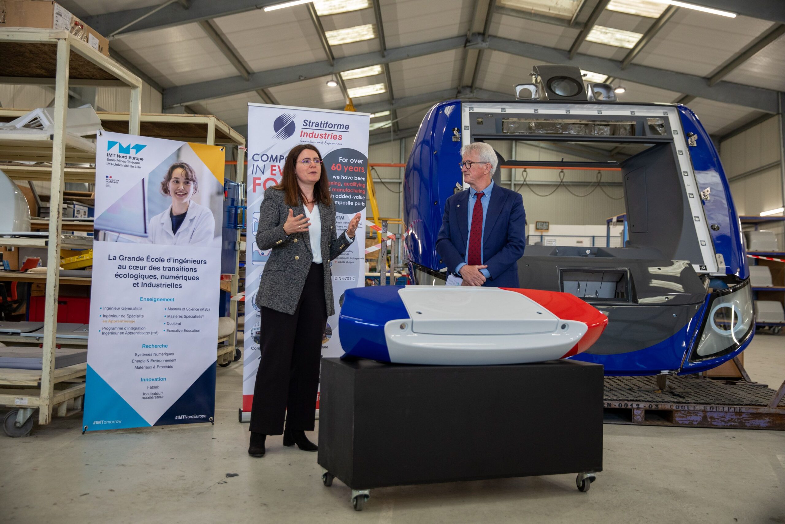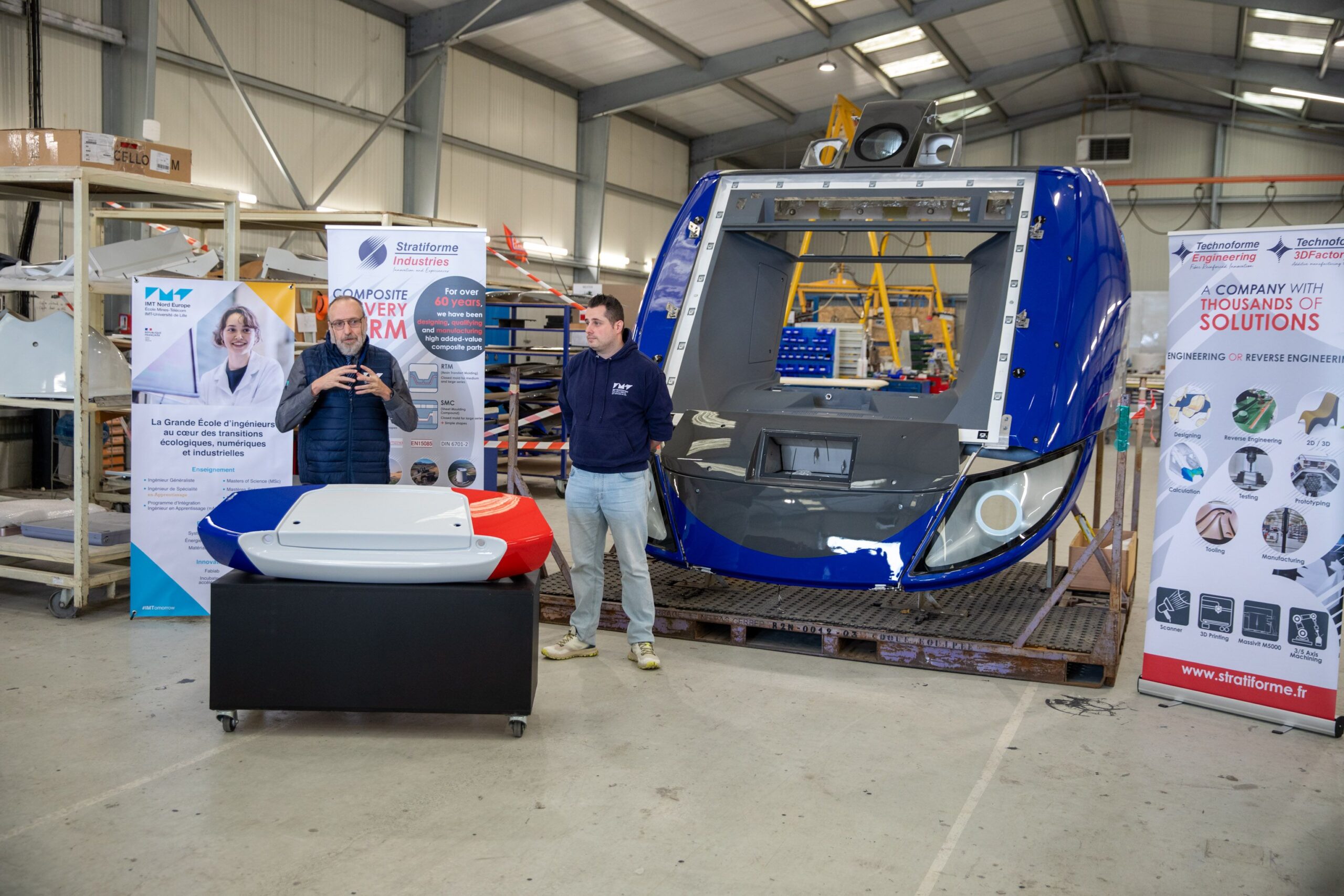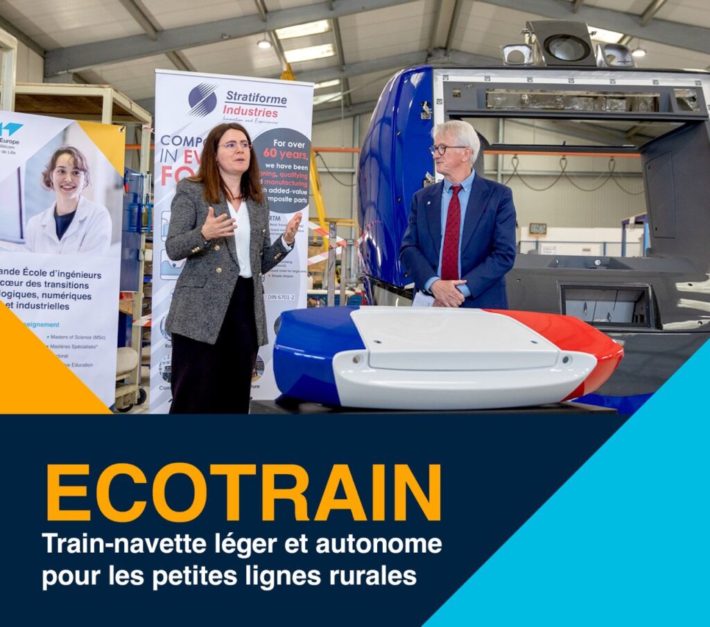 Le 22 mai 2025, les partenaires du projet ECOTRAIN ont présenté à la presse les dernières avancées de cette initiative soutenue par l’ADEME et France 2030. Cette rencontre a marqué un jalon important : l’assemblage imminent de la cabine en matériaux composites, conçue par Stratiforme et équipée des capteurs intelligents développés par IMT Nord Europe, avec la base roulante. Une étape décisive avant les premiers essais prévus à l’automne 2025.